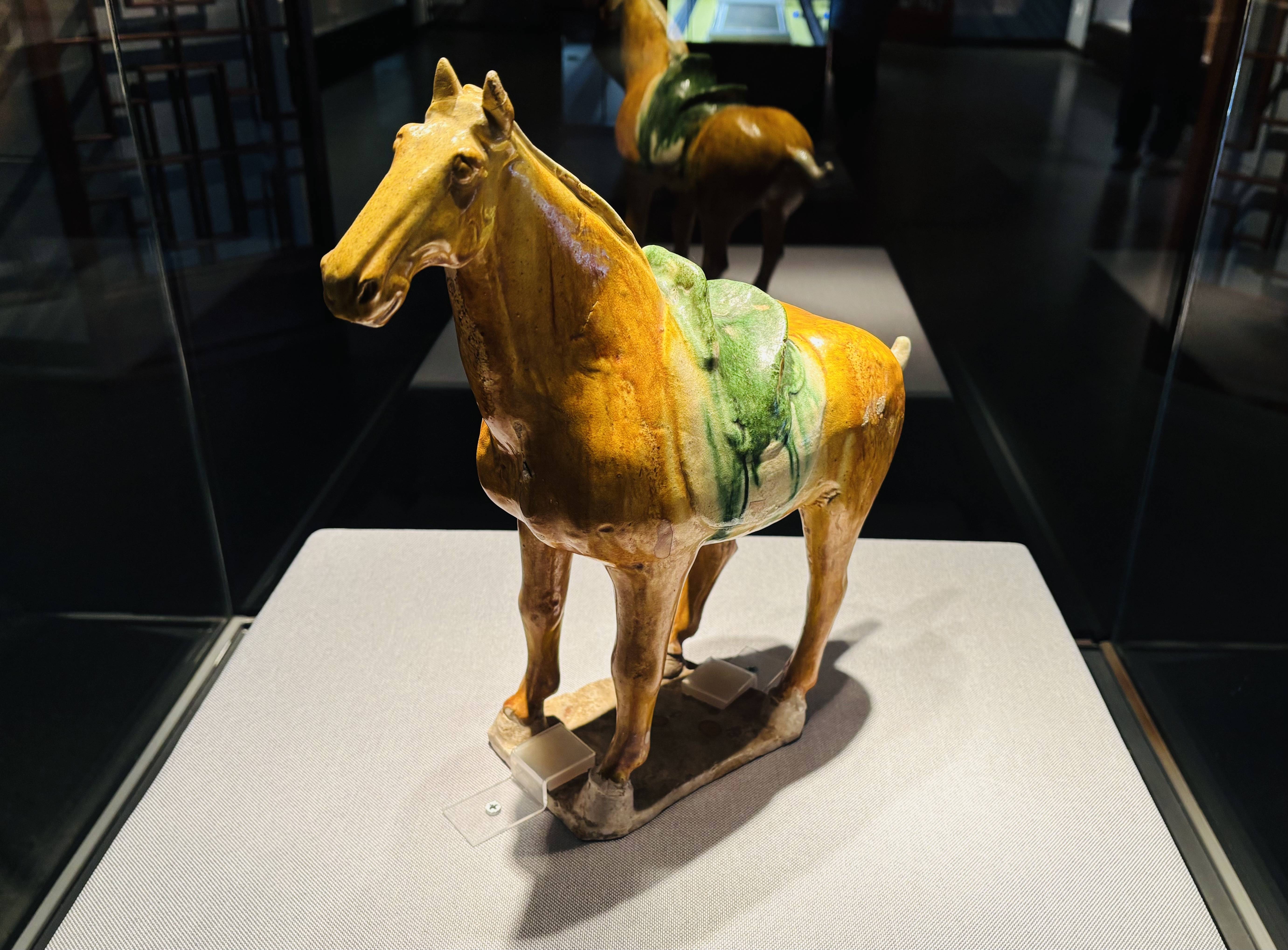 天津博物馆展出的唐三彩马。新华社记者 周润健 摄天津博物馆馆员、策展人李文静介绍,唐三彩马和一件甲骨是展览中的明星展品。提到唐代的瓷器,人们通常会首先想到唐三彩,它不仅是唐代陶瓷艺术的杰出代表,更以其绚丽的色彩和生动的造型,成为大唐盛世文化的重要象征。“唐三彩中最具代表性的就是唐三彩马,展览中的这件珍品,更是将唐马的姿态之美展现得淋漓尽致。”李文静说。