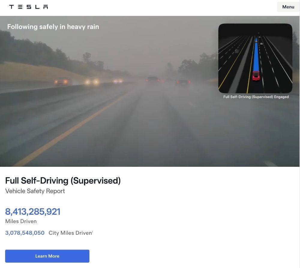 特斯拉官方安全报告显示,FSD (监督式全自动驾驶) 累计行驶里程已达 84.1 亿英里(约135亿公里)