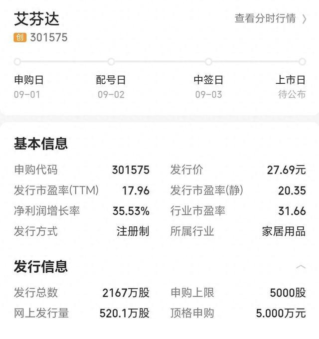 据同花顺iFinD查询,下周(9月1日-5日)有一只新股申购,为创业板新股艾芬达,申购时间为9月1日周一,发行价格为27.69元。艾芬达是国内电热毛巾架代工出口龙头,公司主要产品包括卫浴毛巾架系列产品和温控阀、暖通阀门、磁性过滤器等暖通零配件。艾芬达公司全称为江西艾芬达暖通科技股份有限公司。艾芬达本次计划发行不超过2167万股。