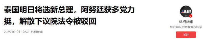 9 月 3 日,泰国国会下议院发布通告称,9 月 5 日将举行会议选举总理。阿努廷也声称,他已经从自己的政党以及其他盟友处获得了 146 票,而人民党的 143 位议员也将支持他,在 492 名下议院议员中,他有望得到超过 247 票的多数支持。从目前这个情况来看,阿努廷当选新总理的可能性很大,所以说新总理人选基本已定,他算是暂时赢下了这一局。